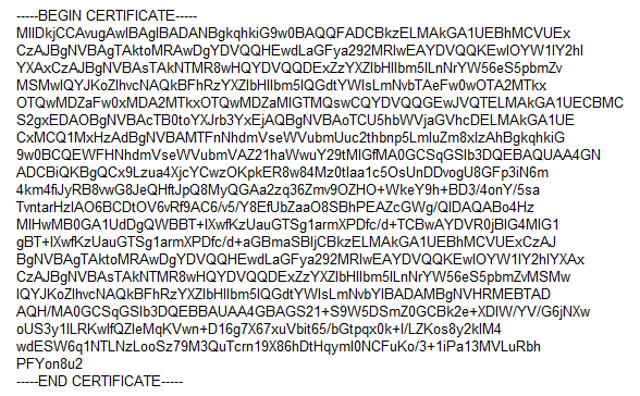 The certificate itself represents base64 encoded data that contains information about the entity the certificate was issued for, public key required for encryption and digital signature verification, and digital signature created with the private key of the certificate issuer.