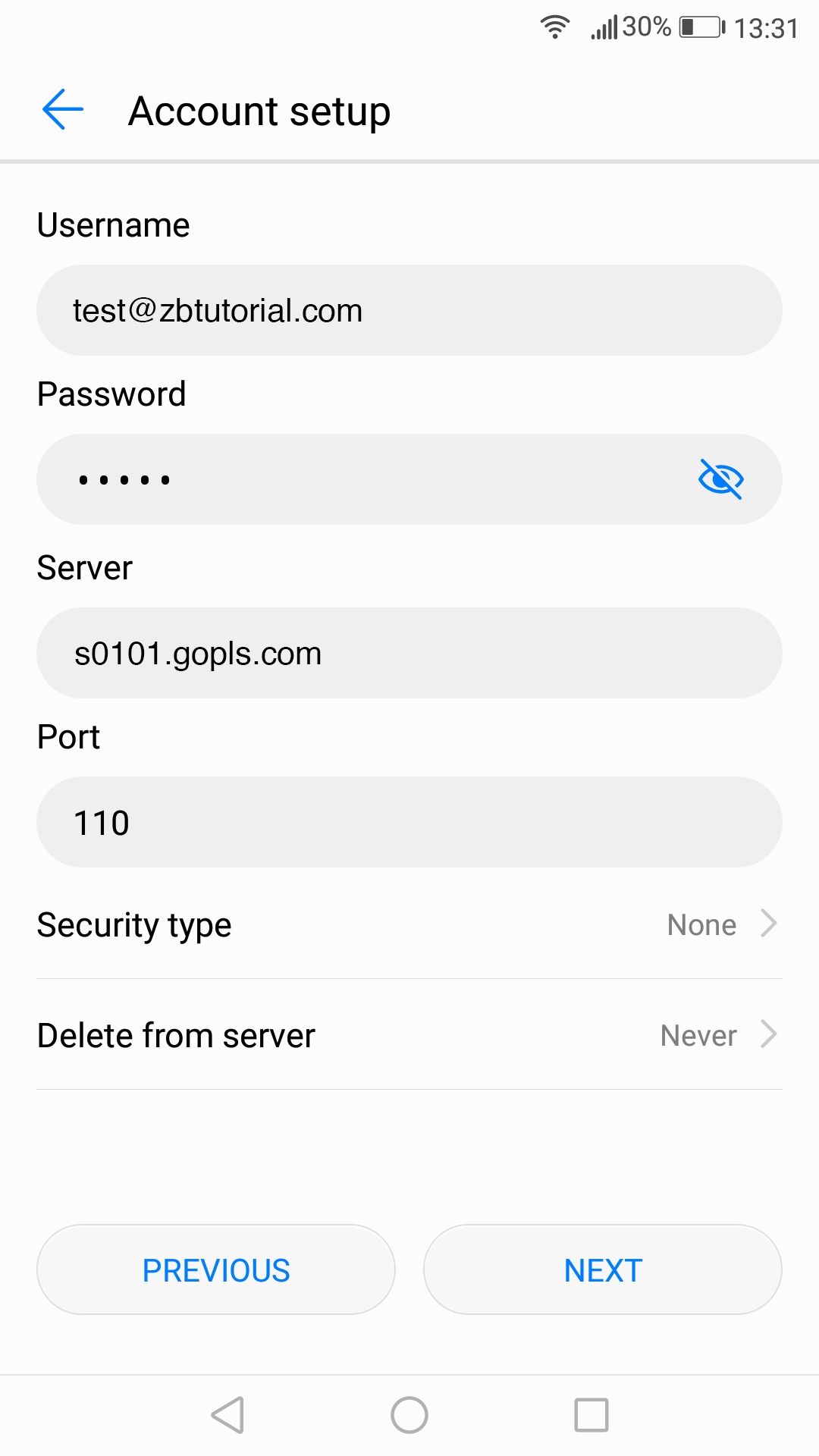 6. If you do not want to use Secure Sockets Layer connection: port 110 and Security type None: