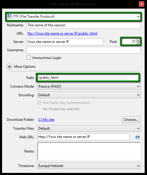 The Path field in the More Options section can be used if you want to specify the folder which opens up after the FTP session starts up. If you use a cPanel user name and you want to upload the website for the main domain name under your account, input the following folder in the Path field: